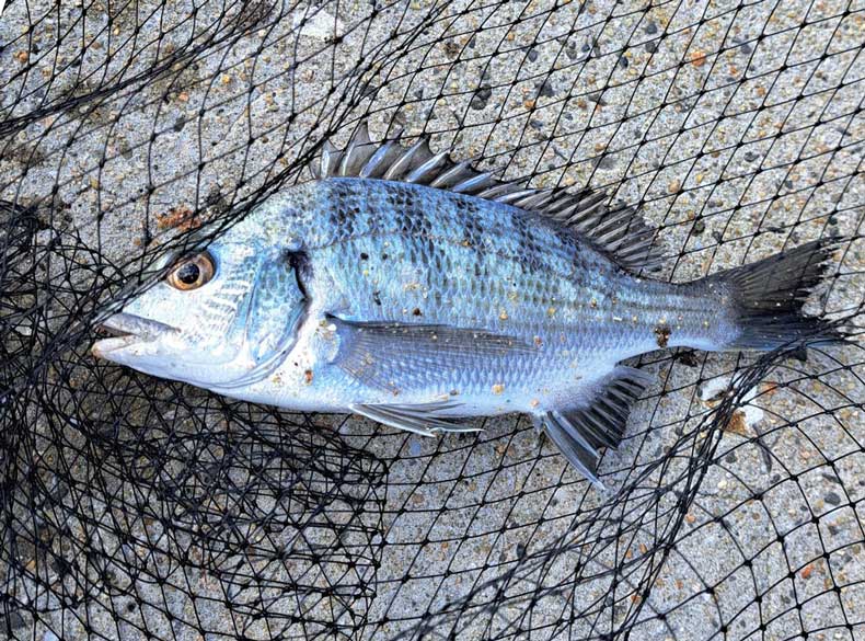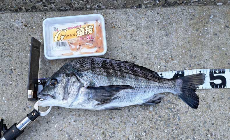 連発はないものの、あれよあれよで上げの潮約4時間で46cmをあたまにチヌサイズ10枚、メイタ37~39cmを3枚、子メイタ4尾、プラスチャリコでお昼の満潮前までにストリンガー満員御礼。まだまだ釣れそうでしたが12時過ぎに納竿にしました