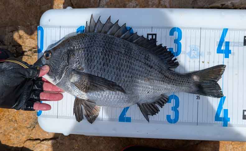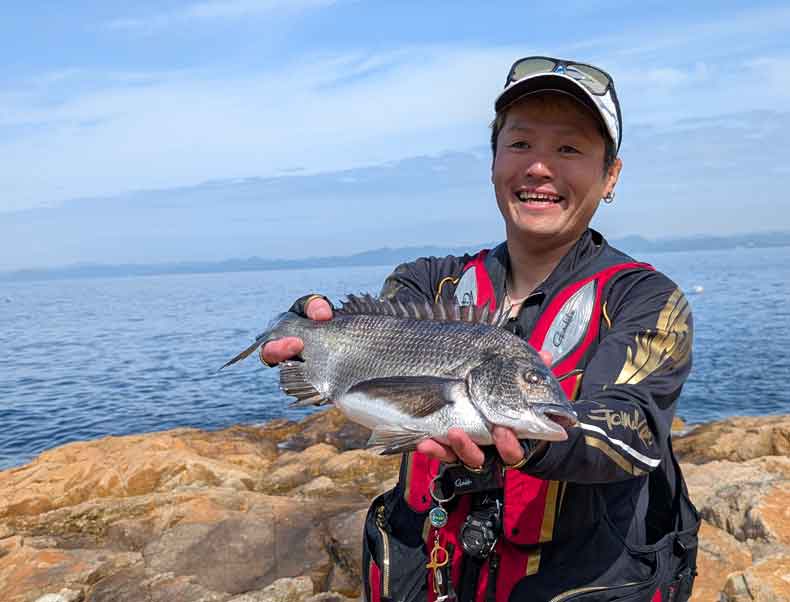 潮がじっくり右へ流れる絶好の状況の中、開始早々に40cmのチヌをキャッチ!そこから怒涛の3連発で、早々に目標の5匹を達成しました