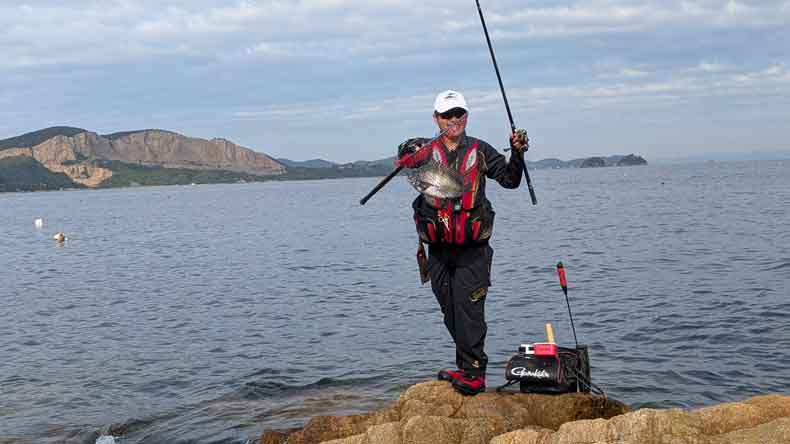 開始時はあて潮で反応が薄かったものの、1時間後の潮止まり直前、手前のポイントでウキがスパッと消える会心のアタリ!ファーストヒットは45cmの綺麗なチヌでした